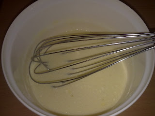 Erstmal rührt man aus Eiern, Mehl und Milch einen Pfannkuchenteig zusammen.